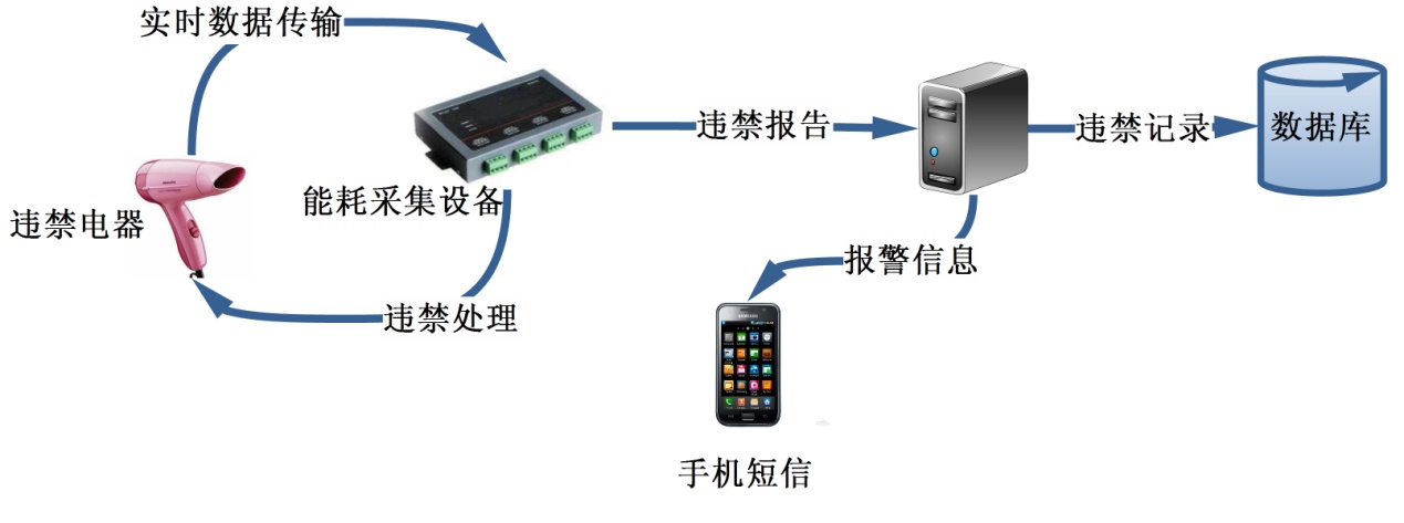 能够识别违禁电器,并限制使用,同时具备定时供电、断电能力。系统采用用电器特性识别技术,结合系统内部的用电规则,达到识别违禁电器并限制其使用的目的。